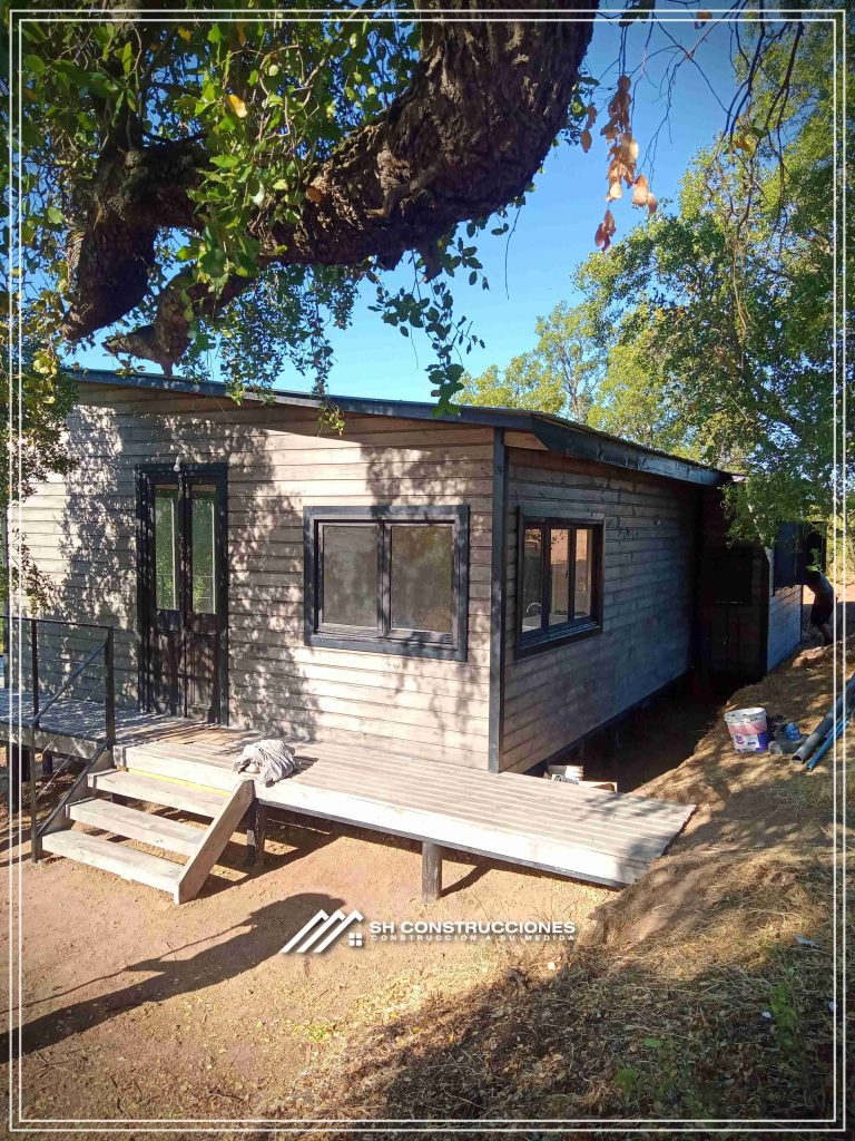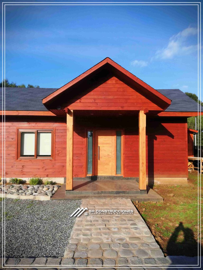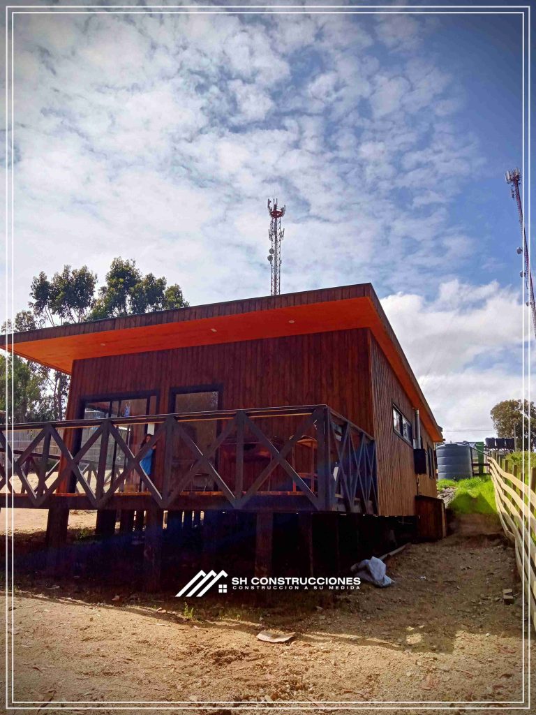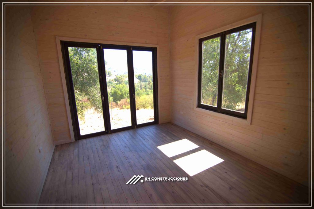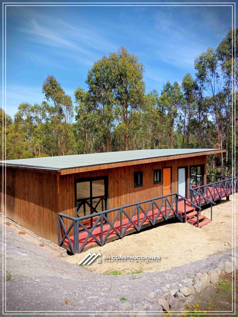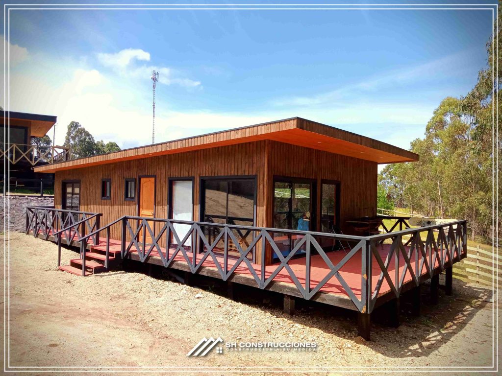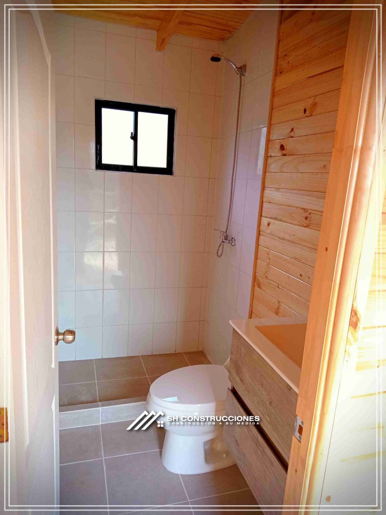Montada sobre fundación hormigoPiso radier 10 cm, posterior cerámica o piso flotanteCubierta teja asfáltica color a eleccionAislación humedad en piso, muros y cieloAislacion térmica muros y cieloEstructura paneles Pino 2×4 ImpregnadosRevestimiento exterior madera impregnada tipo siding 1×6”, siding fibrocemento o fibrocemento con revestimiento texturadoRevestimiento interior madera o yeso cartonInstalaciones eléctrica según norma SEC,Instalacion gasfitería en cobrePuerta acceso atablerada, puertas interiores tipo sinfonía o similarVentanas aluminio tono a elección y cristal monolítico. Termopanel considera costo adicionalInstalación alcantarillado en interior de vivienda, fosa séptica se considera costo adicionalconexión a empalmes correspondientes de luz, agua y alcantarillado se cocidera costo adicionalEn Baños perímetro duchas con cerámicaArtefactos en completos en bañosEn cocina lava platos 1,20 mts y calefond 11 ltEstructura cubierta tabla 1×4 impregnadaCubierta Zinc acanaladoPintura exterior algifol madera tono a eleccion e interior según revestimiento